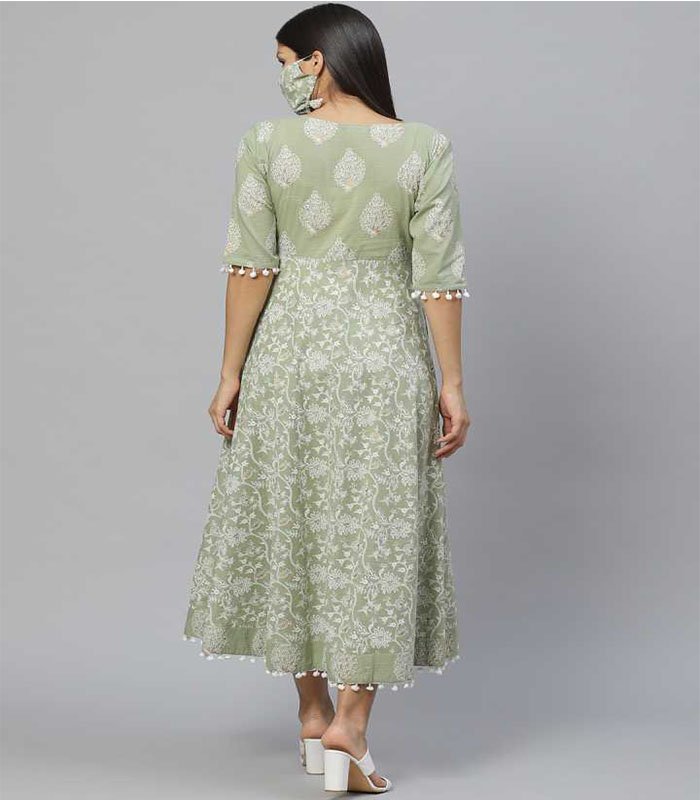 Green Cotton Printed Fit And Flared Maxi Dress With Cotton Printed Mask